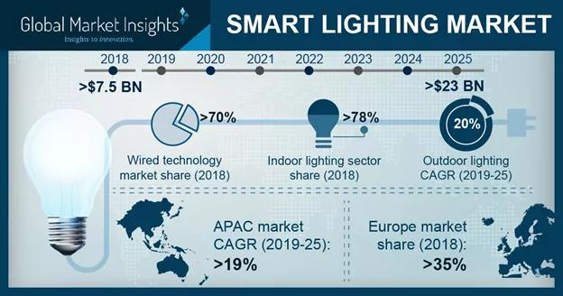 在接下來的幾年中,智能照明市場預(yù)計將呈指數(shù)級增長。據(jù)市場調(diào)研公司Global Market Insights進(jìn)行的研究非常明顯地表明了這一領(lǐng)域的商業(yè)化市場規(guī)模,該研究稱,到2025年底,智能照明行業(yè)的市場份額將超過230億美元的總估值。預(yù)計從2019年到2025年的復(fù)合年增長率將超過15%。