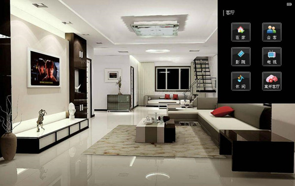 會客模式:按下場景面板上的“會客模式”按鍵,房間的燈光變亮了、電視機關(guān)閉、并響起了舒緩的背景音樂歡迎客人的到來。
